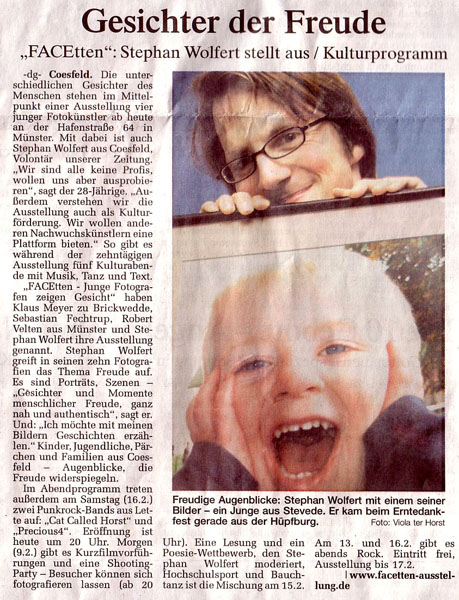 Als Stephan Wolfert in der Wochenkonferenz die anderen Mitglieder der Coesfelder Lokalredaktion zu seiner Ausstellung einlud, waren seine Kollegen begeistert. „Da müssen wir doch berichten. Ein Coesfelder macht eine Ausstellung. Und noch dazu einer, der für uns arbeitet“, regte der leitende Redakteur an. Gesagt, getan. Und so erschien am Freitag, dem 8. Februar ein freudenvoller Bericht auf der ersten Lokalseite der Allgemeinen Zeitung.